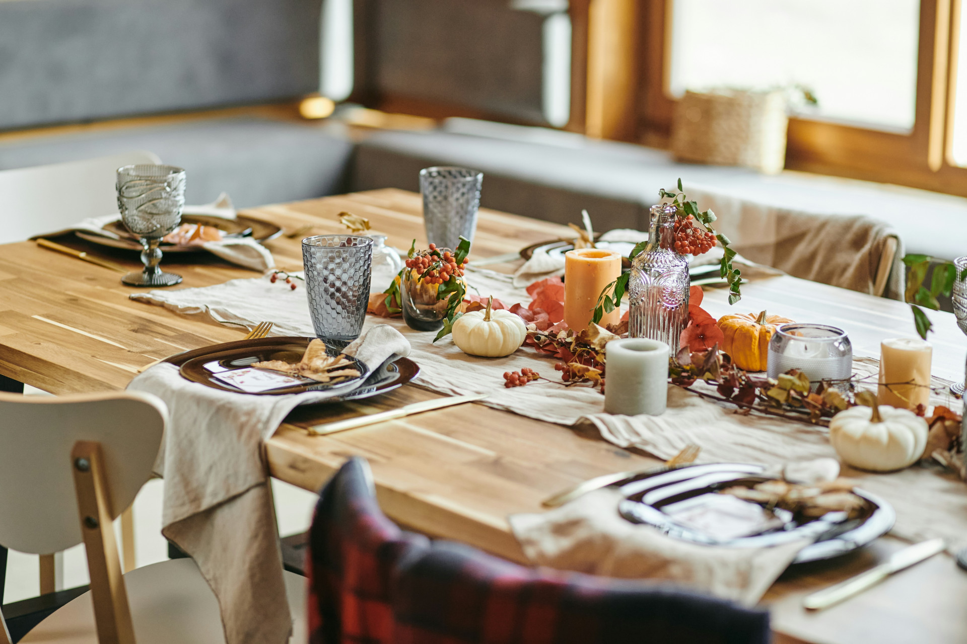 Når bladene falder, og dagene bliver kortere, er det tid til at skabe varme og hygge omkring bordet. Vælg tekstiler i dybe farver som okker, bordeaux eller mørkegrøn, og kombiner dem med grove materialer som uld, filt eller linned. En løber i naturfarvet stof kan give struktur og samle bordets elementer.